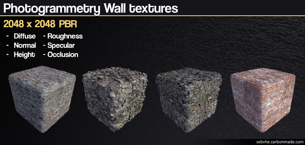 4 x 2048² photogrammetric, Fully PBR textures to use with realtime engines such as Unreal Engine 4